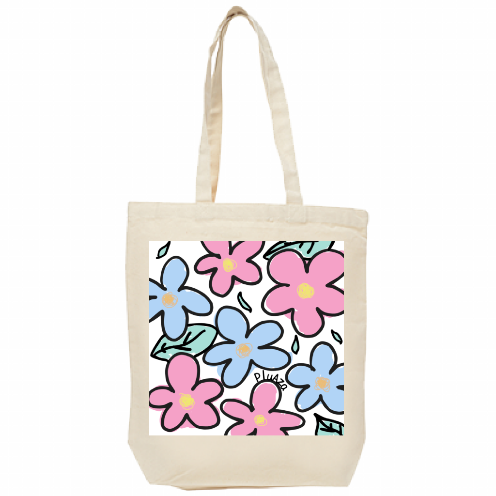 「キャンバストートバッグ/ 花柄 flower」は、ピンクとブルーの花柄をデザインした日常使いのトートバッグです。