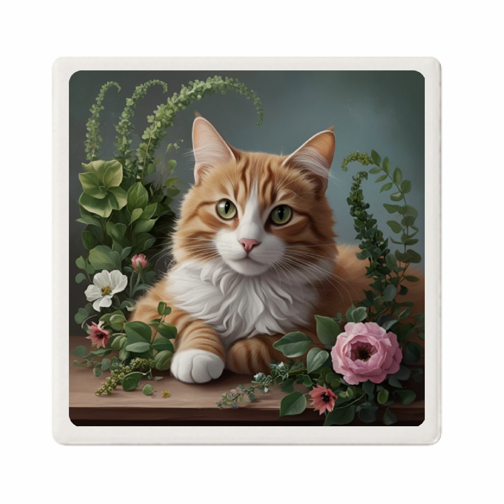 「花に囲まれた猫のコースター」は、花に囲まれた猫が、あなたの日常にささやかな癒しをお届けします。